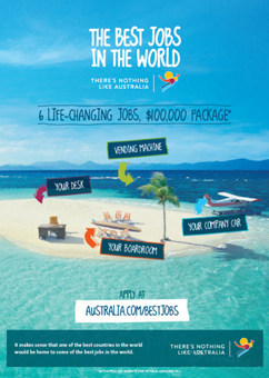 “世界上最好的工作”是澳大利亞旅游局面向全球推廣工作假期簽證計(jì)劃的主要組成部分。工作假期簽證為18-30歲的外國(guó)公民提供12個(gè)月的工作旅行機(jī)會(huì),讓年輕的旅客來(lái)澳大利亞度過(guò)長(zhǎng)假,同時(shí)從事短期工作以補(bǔ)充旅行費(fèi)用。(目前該類型簽證并不覆蓋中國(guó)大陸地區(qū))澳大利亞旅游局董事總經(jīng)理Andrew McEvoy表示,該活動(dòng)將打造一個(gè)優(yōu)質(zhì)平臺(tái),吸引全世界的年輕人來(lái)到澳大利亞。“我們已經(jīng)打造出了最成功的旅游傳播活動(dòng),并將它做得更大更好。借此,澳大利亞將向世界傳播我們令人窒息的風(fēng)景、獨(dú)特的生物群落、美食與美酒,當(dāng)然還有澳大利亞人的娛樂精神。”