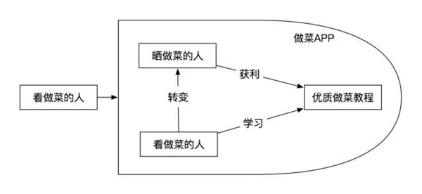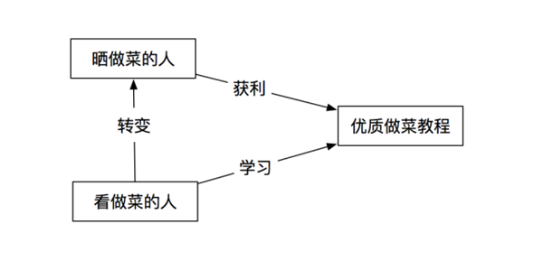 我們可以看到,兩種角色的目的是一致的,那么,根據(jù)前文可以知道,曬怎么做菜的人黏度更大,是相對(duì)更為優(yōu)質(zhì)的用戶,那么我們就需要有一個(gè)機(jī)制讓看怎么做菜的人轉(zhuǎn)變?yōu)闀裨趺醋霾说娜?,從而得到下圖: