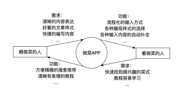 回過頭來看,我們構(gòu)建了產(chǎn)品心智,吸引了目標(biāo)用戶來嘗試使用我們的產(chǎn)品,我們加強(qiáng)了用戶中各種角色的關(guān)系,讓他們能夠相互之間獲利,提高了一定的用戶黏度。但是,是不是覺得總是少了哪部分的思考?是的,從用戶本身的訴求出發(fā),用戶使用我們產(chǎn)品的目的是什么?還是用我們做菜APP來舉例,不同的用戶在使用APP時(shí),可能會(huì)有想要達(dá)到的各種不同的目的,這里只闡述做菜APP中的一個(gè)最常見目的,用來表述思路。